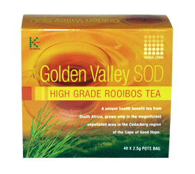 Products health drink golden valley sod high grade rooibos tea golden valley sod high grade rooibos teacontains s o d super oxidant dismutase which acts as an anti oxidant agent to keep free radicals in the body in check.